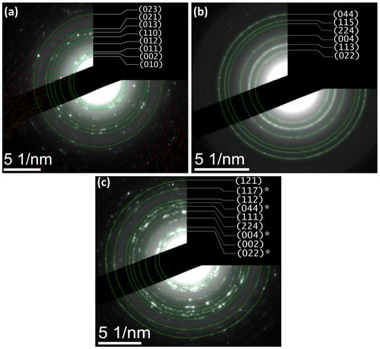 SAED patterns indexed to (a) ZnO (wurtzite), (b) Fe3O4 (inverse spinel), and (c) ZnO/Fe3O4 nanostructures, displaying concentric diffraction rings consistent with polycrystalline domains. Asterisks (*) mark reflections assigned to Fe3O4.