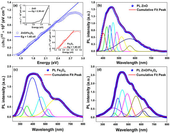 (a) Bandgap luminescence analysis for ZnO/Fe3O4 (Eg = 1.45 eV, main panel); insets: ZnO (Eg = 2.36 eV) and Fe3O4 (Eg = 1.46 eV). (b–d) Room-temperature deconvolved steady-state PL spectra for ZnO, Fe3O4, and ZnO/Fe3O4 nanomaterials.