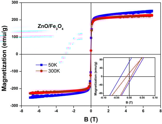 Field-dependent magnetization (M–B) curves of the ZnO/Fe3O4 nanocomposite measured at 50 K and 300 K. The inset highlights the enlarged low-field region, showing the coercive field and remanent magnetization differences between the two temperatures.