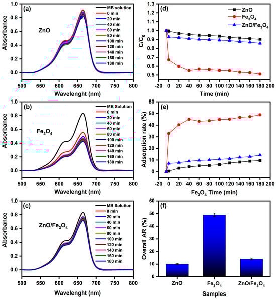 (a–c) UV–vis spectra of MB solution (10 mg L−1) recorded from 0 to 180 min in the absence of light using ZnO, Fe3O4, and ZnO/Fe3O4 nanomaterials; (d) Normalized concentration (C/C0) versus time; (e) Instantaneous adsorption rate; (f) Overall adsorption removal (AR) after 180 min.