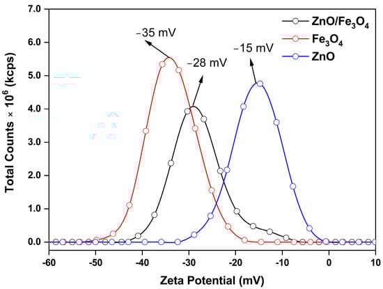Zeta potential distributions of ZnO, Fe3O4, and ZnO/Fe3O4 nanomaterials measured in aqueous suspension.