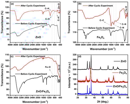 Post-cycle stability of the photocatalysts. FTIR spectra of (a) ZnO, (b) Fe3O4 and (c) ZnO/Fe3O4 before (black) and after (red) four photocatalytic cycles for MB degradation. (d) XRD patterns of ZnO, Fe3O4 and ZnO/Fe3O4 after cycling.