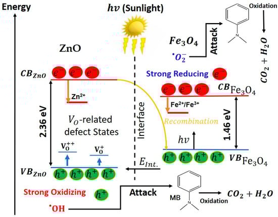 Among earth-abundant oxides, ZnO remains a benchmark photocatalyst for methylene blue (MB) abatement thanks to its low toxicity, scalable synthesis, strong band-edge absorption, and versatile defect chemistry [17,18,19]. Its optical and defect landscape can be rationally tuned by morphology control, dopant incorporation, and surface functionalization, enabling efficient harvesting of near-UV photons and activation of OH−/H2O into highly oxidizing ROS. Across morphologies and dopant sets, ZnO frequently displays pseudo-first-order kinetics under sunlight once dark adsorption is corrected, making it particularly amenable to kinetic benchmarking and cross-study comparison [20,21]. Several recent studies report rapid, reproducible MB degradation with ZnO or ZnO-based composites at realistic loadings, near-neutral pH, and modest light intensities, reinforcing its role as a standard against which more complex hybrids are measured [22,23,24]. Further, recent eco-sustainable routes have also shown that defect-rich ZnO nanoparticles obtained with natural extracts can simultaneously exhibit strong UV–vis absorption, intense defect-related PL and high photocatalytic and antimicrobial activity, particularly for methylene blue and other organic pollutants [25]. Conversely, Fe3O4 alone is generally adsorption-biased and photochemically weak for MB under sunlight; intervalence charge-transfer transitions and fast non-radiative relaxation depress ROS yields unless H2O2 is added (photo-Fenton regime) or the ferrite is hybridized with a more photoactive phase [25,26,27]. Hence, ZnO/Fe3O4 heterostructures often exhibit intermediate or ZnO-like kinetics but markedly superior operability due to magnetic retrieval, with absolute rates governed by interface quality, defect alignment, and optical cross-section dilution across the two phases [26,27,28,29].