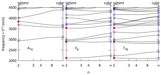 Shape variation of the A1g (left), Eg (center) and T2g (right) frequencies of nanoparticles made of isotropic gold with the rigid boundary condition. The frequencies are normalized after multiplication by the cubic root of the volume and are expressed in m/s. The superspheroid shape varies from a sphere () to a cube (). Normalized frequencies calculated from the analytical expressions for the sphere are plotted with round symbols. Red disks are for the spheroidal modes with (A1g) of (Eg + T2g). Other spheroidal or torsional modes are plotted with blue circles. FEM eigenfrequencies for the cube are plotted with empty blue squares.