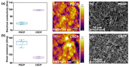 Boxplots of (a) conductivity and (b) sheet resistance of PSCP and CSCP conductive carbon pastes, AFM images of (c) PSCP and (d) CSCP conductive carbon pastes, and SEM top-view images of (e) PSCP and (f) CSCP.