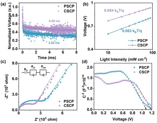 (a) TPV plots; (b) VOC versus light intensity plots of PSCP, PSCs, and C-PSCs; (c) EIS plots of PSCP and CSCP-based PSCs, with the inset showing the equivalent circuit used for fitting the Nyquist plots; (d) Mott–Schottky plots.
