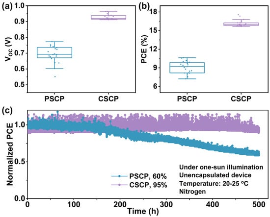 Boxplots of (a) VOC and (b) PCE values extracted from the J-V measurements of PSCs based on PSCP and CSCP (20 independent devices). (c) Maximum power point tracking (MPPT) of the unencapsulated PSCP and CSCP PSCs comparing power output under 1 sun illumination, negative bias voltage, normal temperature, and N2 conditions.