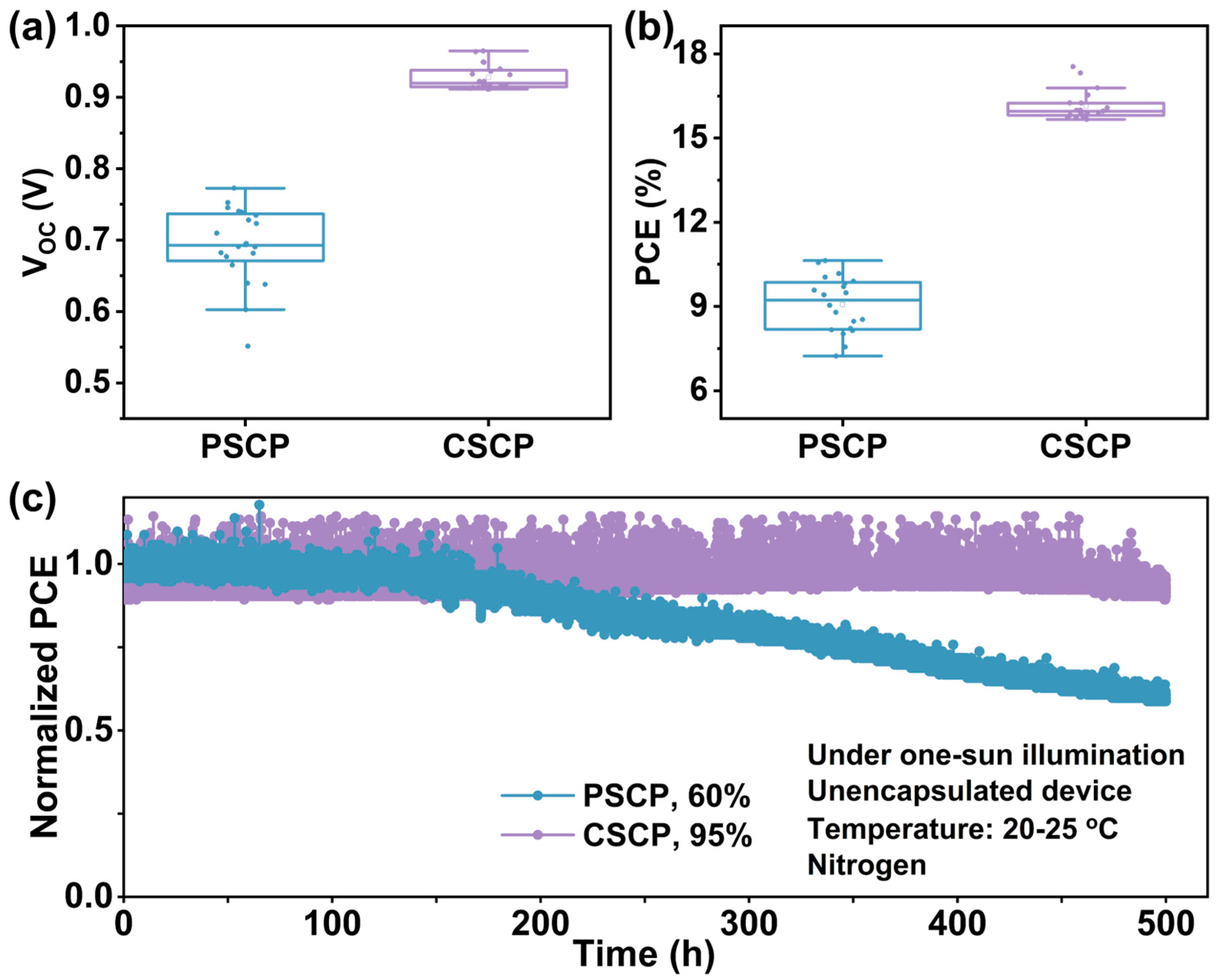 Figure 6. Boxplots of (a) VOC and (b) PCE values extracted from the J-V measurements of PSCs based on PSCP and CSCP (20 independent devices). (c) Maximum power point tracking (MPPT) of the unencapsulated PSCP and CSCP PSCs comparing power output under 1 sun illumination, negative bias voltage, normal temperature, and N2 conditions.