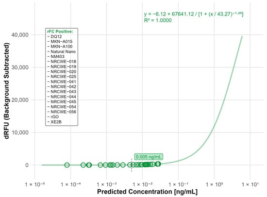 Nanomaterials identified as endotoxin positive in the rFC analysis. The standard curve was fitted using a four-parameter logistic (4PL) model (R2 = 0.9994) with a limit of detection (LOD) of 0.005 ng/mL. The limit of detection (LOD) is indicated by the black dashed line. Open circles indicate predicted endotoxin concentrations of tested nanomaterials. Materials listed in the frame were identified as endotoxin-positive based on responses above the LOD.