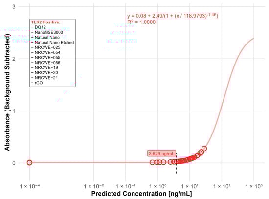 Nanomaterials identified as positive in the TLR2 reporter assay (LOD: 3.83 ng/mL). The standard curve for the TLR2 (LTA) reporter assay was fitted using a four-parameter logistic (4PL) regression model: y = 0.08 + 2.49/(1 + (x/118.9793)−1.46) with R2 = 1.0000. The limit of detection (LOD) is indicated by the black dashed line. Open circles indicate predicted endotoxin concentrations. The positive nanomaterials were listed in the box.