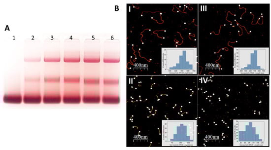 (A)—Electrophoresis of conjugates formed between 8 nm AuNPs and pUC19 DNA cleaved with PluTI and AflIII restriction enzymes. The plasmid was linearized as described in Section 2, producing two DNA fragments of 575 bp and 2111 bp, each containing two 4-base ss overhangs. The cleaved DNA was incubated with 8 nm AuNPs (lane 1: AuNPs only) for 30 min (lane 2), 2 h (lane 3), 4 h (lane 4), and 21 h (lane 5) at 4 °C. An additional sample was incubated for 1 h at 25 °C (lane 6). Prior to electrophoresis, 1 mM BSPP and 10% glycerol were added to each sample. The mixtures were electrophoresed on a 3% agarose gel (100 V, 50 min, ambient conditions). DNA-AuNP conjugates were subsequently electroeluted from the gel and analyzed by AFM, as detailed in Section 2. (B)—AFM images of the 2111 bp (panels (I,III)) and 575 bp (panels (II,IV)) DNA–AuNP conjugates after 30 min and 21 h incubations at 25 °C, respectively. Inserts show statistical contour length distributions. See Table 1 for calculated interparticle lengths values.