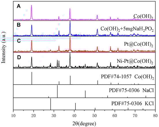 XRD patterns of Co(OH)2, Co(OH)2 + 5 mg NaH2PO2, Pt@Co(OH)2, and Ni-Pt@Co(OH)2.