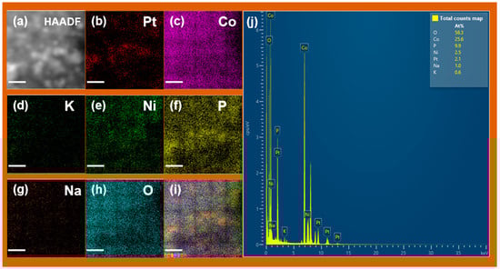 EDS element maps of Ni-Pt@Co(OH)2 showing distributions of (a) HAADF-STEM image, (b) Pt, (c) Co, (d) K, (e) Ni, (f) P, (g) Na, (h) O, (i) composite map and (j) EDS total counts spectrum with quantitative atomic percentages. The scale bars in (a–i) correspond to 10 nm.