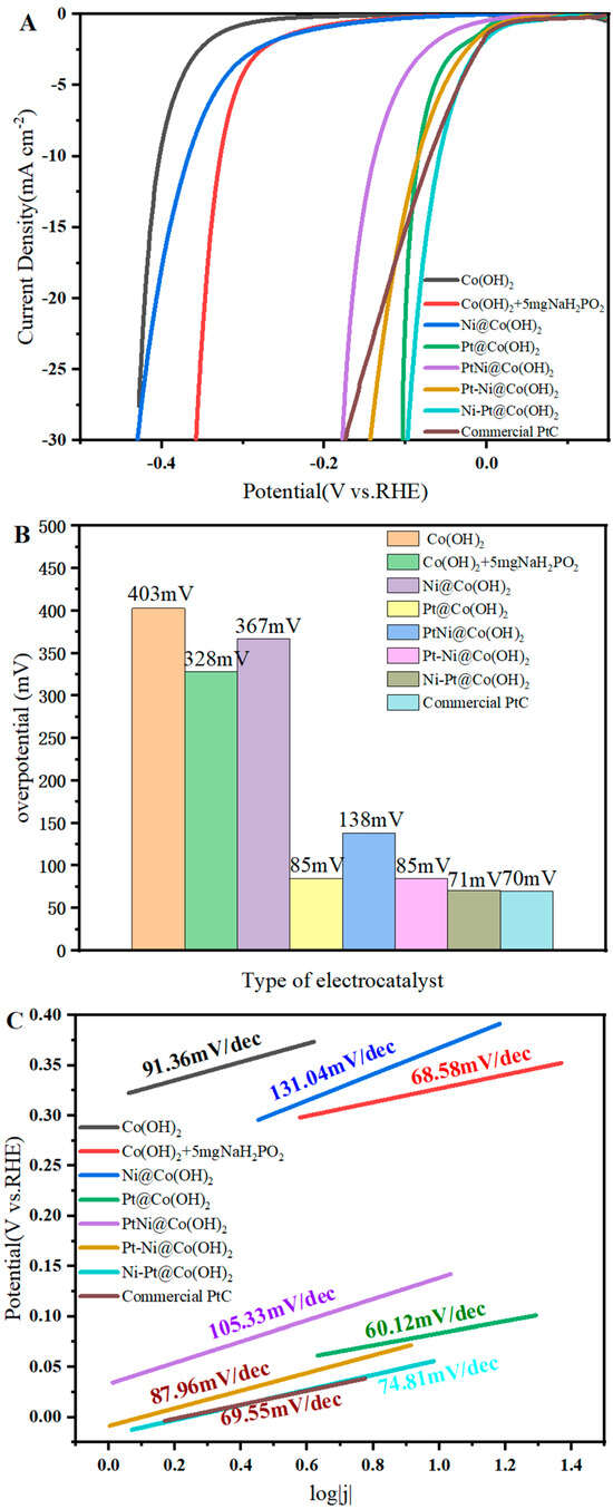 The catalytic activity of the as-prepared catalysts was evaluated using linear sweep voltammetry (LSV) in a standard three-electrode system with 1.0 M KOH electrolyte, in order to assess the feasibility of Pt and Ni modification on the Co(OH)2 precursor. For comparison, Ni-Pt@Co(OH)2 and Pt@Co(OH)2 were benchmarked against the commercial Pt/C catalyst. As shown in Figure 6A, the LSV curves of Co(OH)2, Co(OH)2 + 5 mg NaH2PO2, Ni@Co(OH)2, Pt@Co(OH)2, PtNi@Co(OH)2, Ni-Pt@Co(OH)2, Pt-Ni@Co(OH)2, and commercial Pt/C were recorded in 1.0 M KOH. Among these, Ni-Pt@Co(OH)2 exhibits the best catalytic activity. The bar chart in Figure 6B shows that its overpotential at 10 mA·cm−2 is 71 mV, which is nearly identical to that of commercial Pt/C (70 mV). Figure 6C further compares the Tafel slopes of the corresponding catalysts.