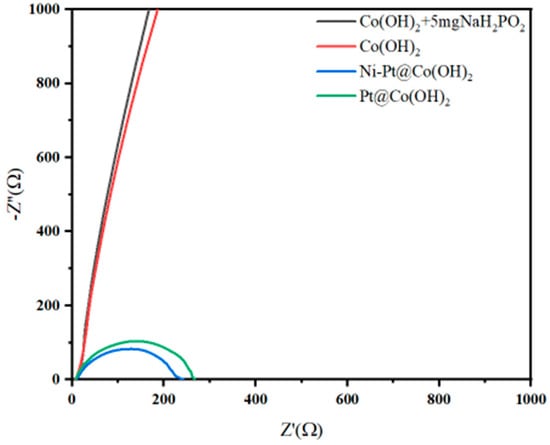 Ni-Pt@Co(OH)2 and Pt@Co(OH)2 exhibit superior electron transport properties and lower interfacial resistance, as evidenced in the EIS measurements by their smaller semicircle diameters, corresponding to lower charge-transfer resistance (Rct). This indicates a more efficient electron transfer process at the electrode/electrolyte interface, which facilitates the electrochemical reaction. As shown in Figure 8, the Rct values of Ni-Pt@Co(OH)2 and Pt@Co(OH)2 are significantly lower than those of Co(OH)2 and Co(OH)2 + 5 mg NaH2PO2, with Ni-Pt@Co(OH)2 displaying the lowest Rct, consistent with its outstanding catalytic activity.