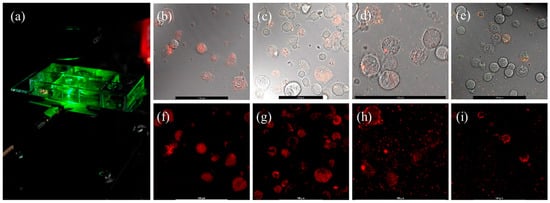 (a) Sample-holder slide with eight wells. (b–e) DIC images with laser overlap from CAD mouse neuron cells loaded with 10 nm, 60 nm, 100 nm, and 140 nm diameter NDs. (f–i) Corresponding confocal PL images with a 568 ALEXA laser. Scale bars on all images represent 100 μm.