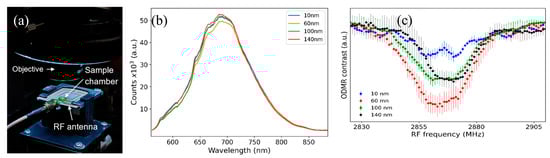 Integration times were adjusted to obtain maximum count rates before ODMR experiments. The average of several zero-field ODMR scans for each ND size is shown in Figure 4c. These data were obtained from NDs absorbed by the CAD cells.
