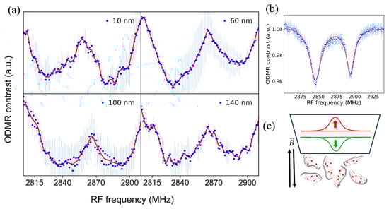 The magnetic field sensing capability of NDs in cells was tested by performing ODMR scans with externally applied 1.7 mT magnetic field to the samples with a Helmholtz coil. ODMR scan results are shown in Figure 5a, where the blue dots are collected data points and represent averages of two or three measurements. While bulk diamond data are typically represented using a double-Lorentzian model, the ODMR data of NV nanodiamonds present a challenge as they cannot be adequately modeled as a sum of two functions. Consequently, we employed cubic spline interpolation on the data after applying smoothing, as represented by the continuous red lines. About 50 MHz splitting of the ODMR dips are visible for all ND sizes due to the Zeeman effect, which agrees with the gyromagnetic ratio of NV defects as shown in Equation (1).