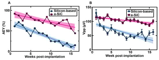 Comparison of silicon-based and a-SiC MEA performance. (A) Comparison between the active electrode yield (AEY) of silicon-based (blue circles) and a-SiC (pink squares) MEAs weekly over the 16-week chronic study with 95% confidence intervals and regression line. At week one, the AEY are significantly different (p < 0.0001). (B) Comparison between silicon-based and a-SiC MEAs’ peak to peak voltages (Vpp) with SEM, 95% confidence intervals, and regression line [45].