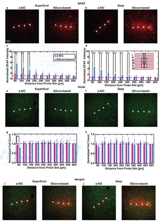 (a,b) Representative images of brain sections stained for glial fibrillary acidic protein (GFAP), showing immune responses at superficial (100–800 µm) and deep (800–1200 µm) depths below the pial surface for a-SiC and silicon-based probes. (c,d) Normalized GFAP intensity (mean ± SEM) as a function of distance from the probe site, comparing the immune response to a-SiC and silicon-based probes (mean ± SEM). The inset diagram in (d) demonstrates the implant location relative to the cortical layer. (e,f) Brain sections stained for neuronal nuclei (NeuN) in superficial and deep layers near both probe types. (g,h) Normalized NeuN cell count at increasing distances from the probe sites, comparing neuron density between a-SiC probes (pink) and silicon-based probes (Blue). (i,j) Merged images of GFAP and NeuN staining in superficial and deep brain layers for both a-SiC and silicon-based probes. White asterisks represent the identified implant holes. The statistical significance is represented by black asterisks (* p < 0.05, ** p < 0.01, *** p < 0.001, **** p < 0.0001) [45].