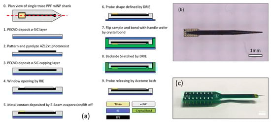 Flexible C/a-SiC electrodes: (a) Schematic of a-SiC/PPF hybrid probe fabrication process. (b) Optical microscope image of released a-SiC/PPF hybrid neural probe. (c) Final packaged device bonded to a PCB header for electrical testing [59].