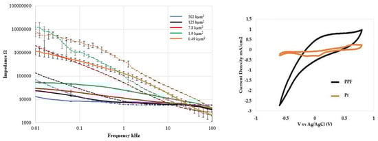Electrochemical characterization of PPF (C) and Pt electrodes vs. recording tip surface areas: (Left) Electrical impedance spectroscopy vs. frequency and (Right) Cyclic-Voltammetry (CV) comparison of PPF and Pt (surface area = 502 kµm2). Note the significantly larger curve area for PPF electrode indicating superior charge storage capacity (CSC) [59].