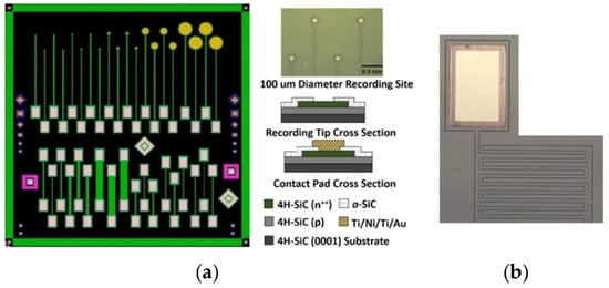 Figure 5 shows two devices designed by Bernardin et al. to investigate the homogeneous 4H-SiC electrode performance [31]. First is a planar microelectrode array (MEA) consisting of twenty single-ended planar electrodes with tip diameters of 25, 50, 100, 400, and 800 μm. These were chosen to evaluate and characterize the electrochemical effects relative to geometric surface area (GSA) of the electrode and the effect of the length of traces on the overall impedance of the device. The second device, an interdigitated electrode (IDE), was created to investigate the electrical efficiency of both the pn junction isolation and the conformal a-SiC insulator that would encapsulate an implantable device. These devices were created by using samples cut from a 4H-SiC epitaxial wafer that was grown to include a p-type base layer capped with an n++ semi-metallic layer. The samples were grown in a hot-wall CVD reactor, which was used to realize two epitaxial layers: first, a 5 µm p-type base layer was grown, followed by a 2.5 µm n+-type electrode layer, thus creating an integral pn junction. Deep reactive ion etching (DRIE) was used to dry etch ~3 µm into the epiwafer, thus removing the n++ layer and exposing the p-type base layer. Photolithography was used prior to DRIE to define the traces, bond pad areas, and electrodes, whereby thick photoresist served as the etch mask. Electrochemical isolation for the p-type and n-type electrodes was achieved through the addition of a 200 nm thick layer of a-SiC. The PECVD process conditions were 13.56 MHz, 250 °C, 900 mTorr, SiH4 360 sccm, CH4 12 sccm, and Ar 500 sccm. Photolithography was used to define the insulator windows, which exposed both the n++ 4H-SiC electrodes (i.e., recording tips) and the 4H-SiC mesa base tab for the formation of metal bond pads to facilitate wire bonding/packaging. Reactive ion etching (RIE) was used to remove the a-SiC film (CF4 37 sccm, O2 13 sccm, 200 W, 50 mTorr) selectively in these two places. The metal bond pads were then defined through a lift-off lithography process and included a thin, base layer of titanium (Ti), followed by a layer of nickel (Ni). These metals were annealed in a rapid thermal process (RTP) at 1000 °C for 30 s to facilitate an ohmic contact. A secondary lift-off process was performed using Ti and gold (Au) deposited directly onto the annealed Ti/Ni stack to create a surface suitable for wire bonding or electrical testing using probes. The final devices were then annealed at 450 °C for 30 min to alloy the bond pad metals, thus lowering their contact resistance. The exact same fabrication procedure was used to realize IDE devices with a 50 μm mesa width and a pitch of 25 µm.
