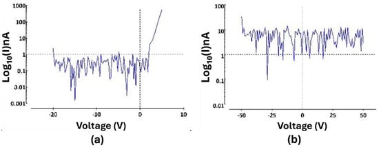 (a) A pn junction IV measurement of the IDE, showcasing a forward-voltage drop of the pn diode of ~2.3 V and a leakage current below 1 nA through −20 V. (b) IV measurement (−50 to 50 V) amongst neighboring traces showcasing minimal crosstalk between two IDE traces [31]. Note that this is effectively a measure of the leakage current from an N-P-N junction and clearly shows current blocking from −50 to +50 V.