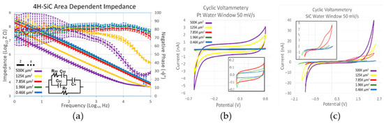 (a) EIS data plot of 4H-SiC electrodes with different geometrical surface areas. (b) CV plot of the single electrodes (a) swept through a platinum water window (−0.6 V and 0.8 V) (c) and swept through the SiC water window (−2.0 V to 2.7 V) [31].