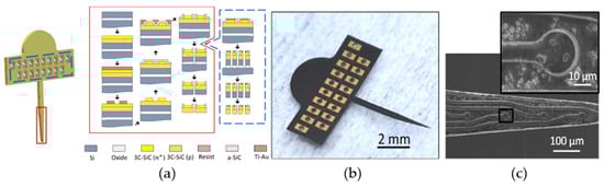 3C-SiC on SOI free-standing probes: (a) Processing flow for the probes, (b) photograph of the released 3C-SiC probe, and (c) SEM micrograph of the traces and recording sites (inset). The quality of the 3C-SiC was marginal, as evidenced by the surface defects observed under SEM [65].