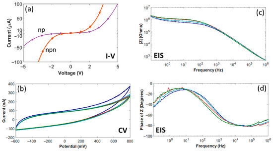 Electrical characteristics of selected 3C-SiC neural implant devices [65]. (a) IV data showing current flow from the N-type mesa to the P-type base (np) and between adjacent traces (npn), respectively. (b) EIS impedance amplitude data as a function of frequency. (c) CV data showing three (3) sweeps over a water window from −600 to + 800 mV. (d) EIS impedance phase data vs. frequency. Multiple colored traces represent repeated trials on the same device and demonstrate consistent electrode behavior.