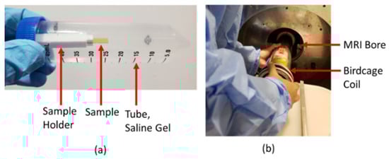 (a) 50 mL centrifuge tube containing an embedded sample w/holder in a gel phantom. (b) Photograph of a birdcage containing the sample from (a) being placed into the 7T MRI bore [85].