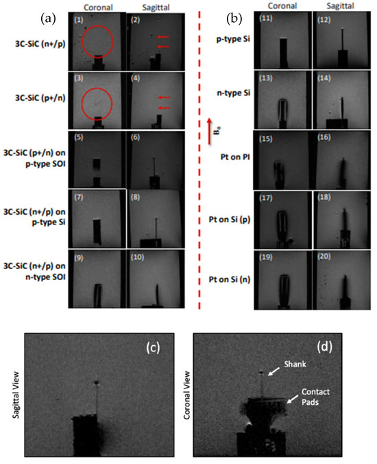 7T MRI images of different semiconductor materials: (a) (1, 2) 3C-SiC (n+/p) is almost invisible in the scan. (3, 4) 3C-SiC (p/n+) similar to (1, 2). (5–8) Minimal artifacts, yet visible samples, for 3C-SiC on p-type SOI and Si substrates. (9, 10). Artifacts and samples are visible for 3C-SiC on n-type SOI substrate. (b) (11–14) Artifact differences between n- and p-type Si substrates. (15–20) Severe image artifacts for all platinum samples. (c,d) The sagittal and coronal views of the 3C-SiC probe, showing a low level of artifacts except at the tip of the device and the area where the gold bond pads are located, which would not be within the tissue [85]. The red circles and arrows in (1) to (4) show the location of the probe which is barely visible in the images.