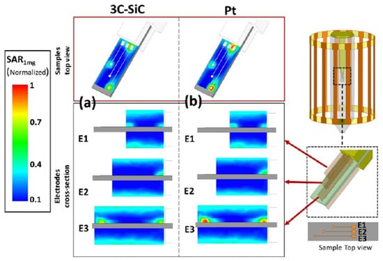 Simulated normalized SAR1mg around the Pt and 3C-SiC (both on Si substrate) samples containing three electrodes. E1, E2, and E3 denote short, medium, and long electrodes, respectively. The results are normalized with the maximum SAR1mg value that occurs in the vicinity of the largest Pt electrode. (a) Estimated normalized SAR1mg for 3C-SiC via FEM electromagnetic simulations in ANSYS HFSS. Both top (top image) and cross-section (bottom images) views for each electrode are illustrated. Maximum estimated SAR1mg for 3C-SiC appeared at the tip of the longest electrode, while the average B1 at the coil isocenter was ~10 mT. (b) Estimated normalized SAR1mg distribution for the Pt sample [85].