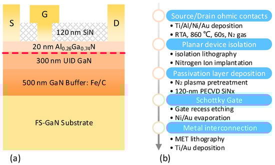 (a) The schematic cross-sectional structure of the GaN-on-GaN HEMTs. (b) Process flow for the fabricated GaN HEMTs in this work.