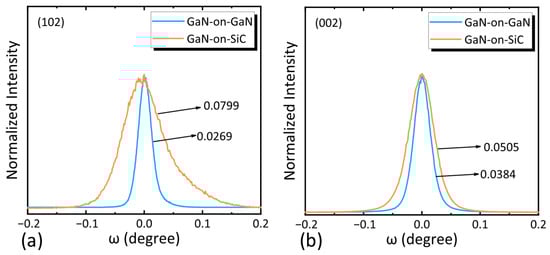 Rocking curves of the (a) (102) plane and (b) (002) plane in the GaN-on-GaN structure and the GaN-on-SiC structure.