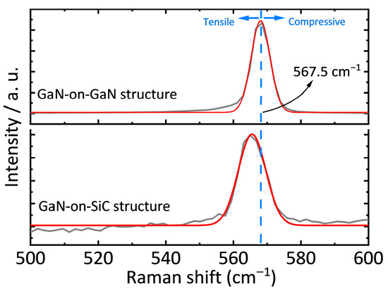 Raman spectrum of the (a) GaN-on-SiC structure and the (b) GaN-on-GaN structure.
