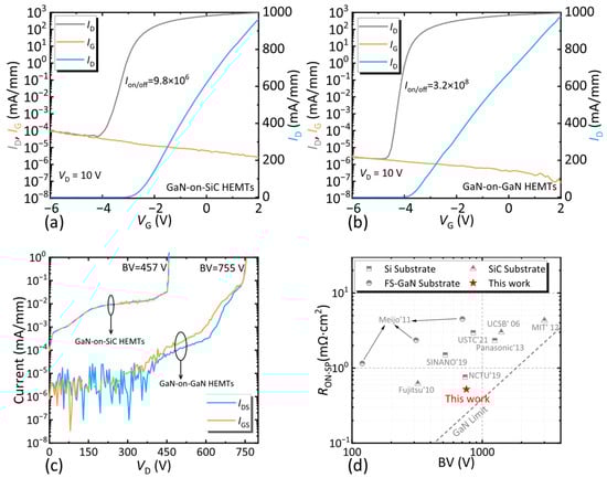 DC electrical properties were measured using Keithley B1500A and B1505A semiconductor device analyzers (Keithley Instruments (now part of Tektronix, Inc.), Solon, OH, USA). Figure 5a,b show the linear and semi-logarithmic transfer characteristics of the GaN-on-SiC and GaN-on-GaN HEMTs, respectively, measured at a drain bias (VD) of 10 V. For the GaN-on-SiC HEMTs, the off-state drain leakage current (ID, OFF) at VG = −6 V was 9.8 × 10−5 mA/mm, the maximum saturated drain current density (ID, max) at VG = 2 V was 960 mA/mm, and the on/off current ratio (Ion/off) was 9.8 × 106. The GaN-on-GaN HEMTs exhibited a much lower ID, OFF (2.6 × 10−6 mA/mm), a comparable ID, max (979 mA/mm), and a significantly higher Ion/off (3.2 × 108). This improvement in off-state performance is attributed to reduced dislocation density—dislocations act as conductive channels in GaN HEMTs, and their minimization effectively suppresses leakage currents [21]. The breakdown voltage (BV) was extracted under a leakage current criterion of 1 mA/mm (Figure 5c). GaN-on-GaN HEMTs with Lsd = 8 μm achieved a BV of 755 V, whereas GaN-on-SiC HEMTs of the same dimensions reached a maximum BV of 457 V. The superior breakdown performance stems from the lattice-matched homoepitaxial structure, which eliminates defect-induced leakage paths. Combined with the low RON-SP of 0.6 mΩ·cm2, the GaN-on-GaN HEMTs achieved a BFOM of 950 MW/cm2 (calculated as BFOM = BV 2/RON-SP)—the highest value reported to date for GaN-on-GaN HEMTs (Figure 5d) [22,23,24,25,26,27], underscoring their potential for high-efficiency power switching.