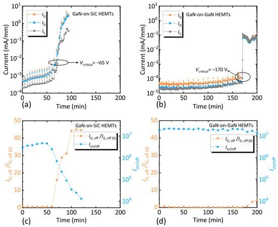 Changes in IG, IS, and ID of (a) the GaN-on-SiC HEMTs and (b) the GaN-on-GaN HEMTs in off-state drain step stress experiments. Relationship between the Ion/off and IG, off/IG, off (0) of (c) the GaN-on-SiC HEMTs and (d) the GaN-on-GaN HEMTs as a function of off-state step drain stress, respectively. IG, off/IG, off (0) is defined as the ratio of the IG, off after each step post-stress to the stress-free IG, off.
