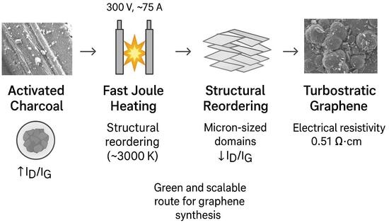 - Mahmood, F.; Mbeugang, C.F.M.; Asghar, F.; Xie, X.; Lin, D.; Liu, D.; Sharma, A.; Chen, J.; Liu, B. Understanding the Synthesis of Turbostratic/Flash Graphene via Joule Heating. Materials 2025, 18, 2892. [Google Scholar] [CrossRef]
