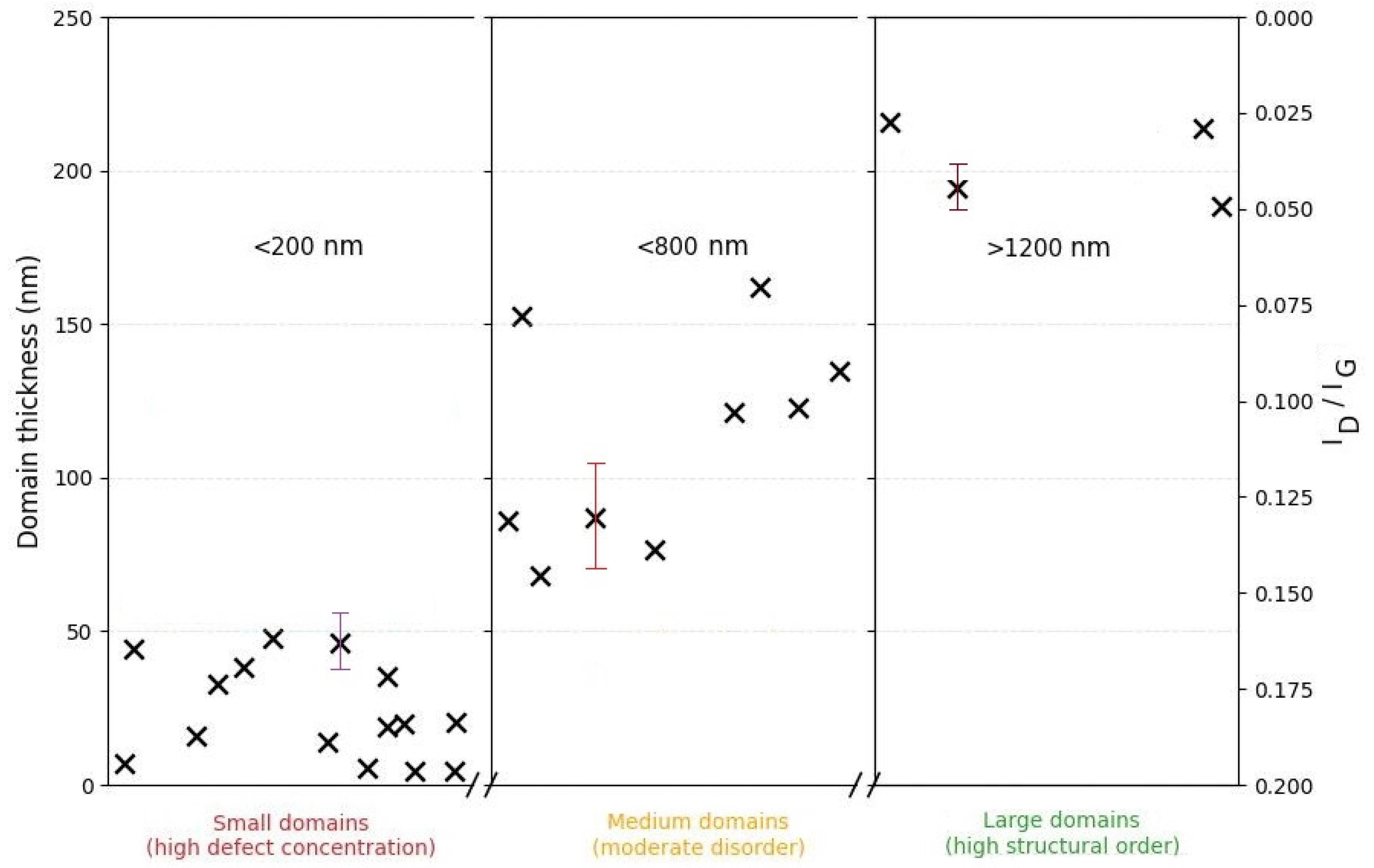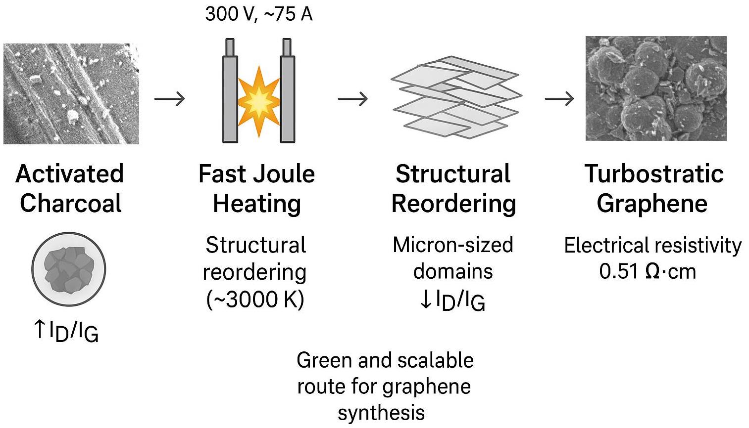 - This work demonstrates that fast Joule heating induces a fundamental structural rearrangement of amorphous carbon, leading to the formation of large hexagonal domains with sizes > 1 µm with thicknesses ranging from a few nanometers to 200 nm, while XRD revealed coherent domains of ~18 layers, confirming the turbostratic nature.