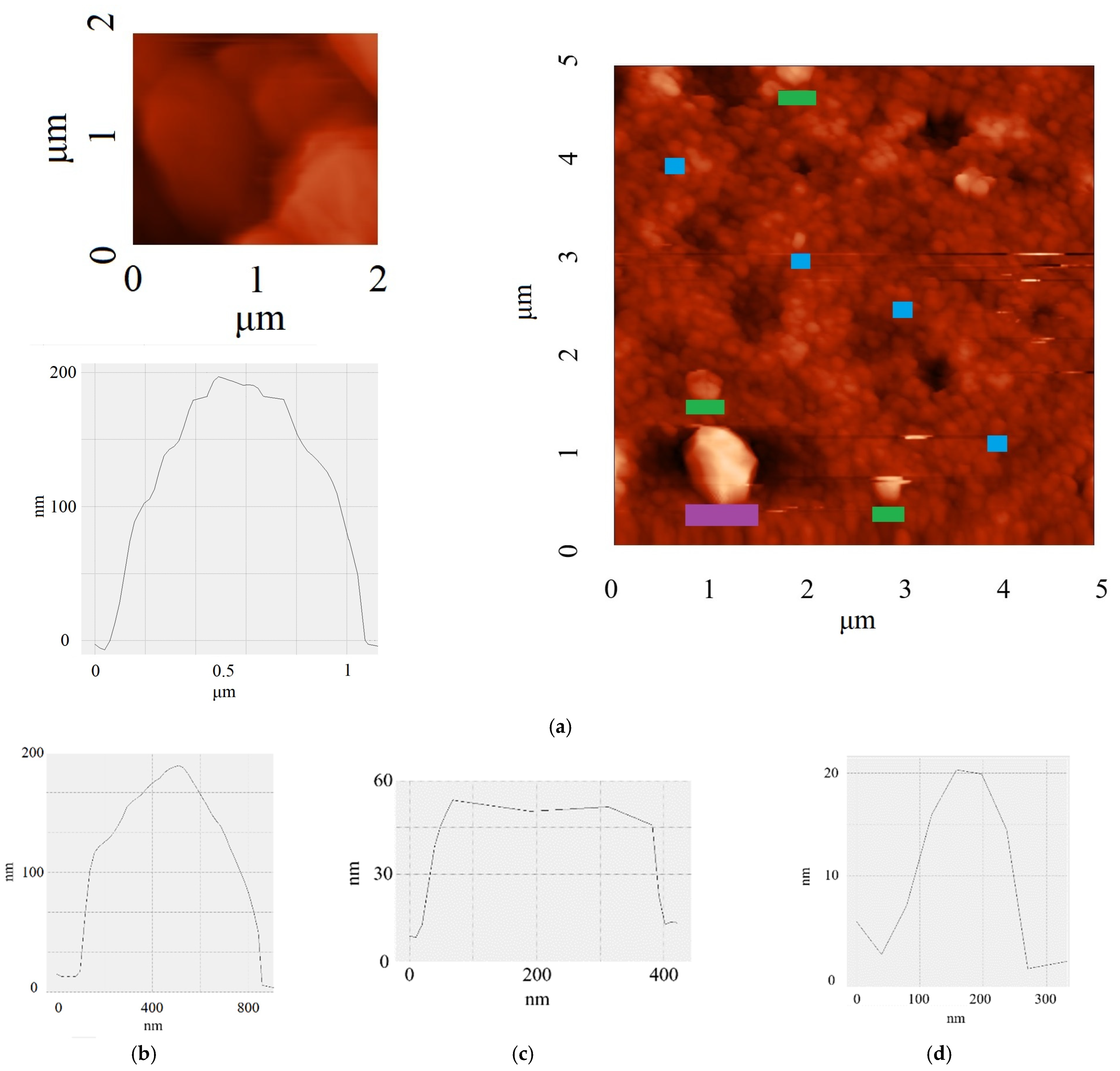 - AFM: Surface morphology measurements were performed in semi-contact (tapping) mode using standard NSG10 cantilevers (TipsNano, Zelenograd, Russia) with a probe tip radius of 10 nm.