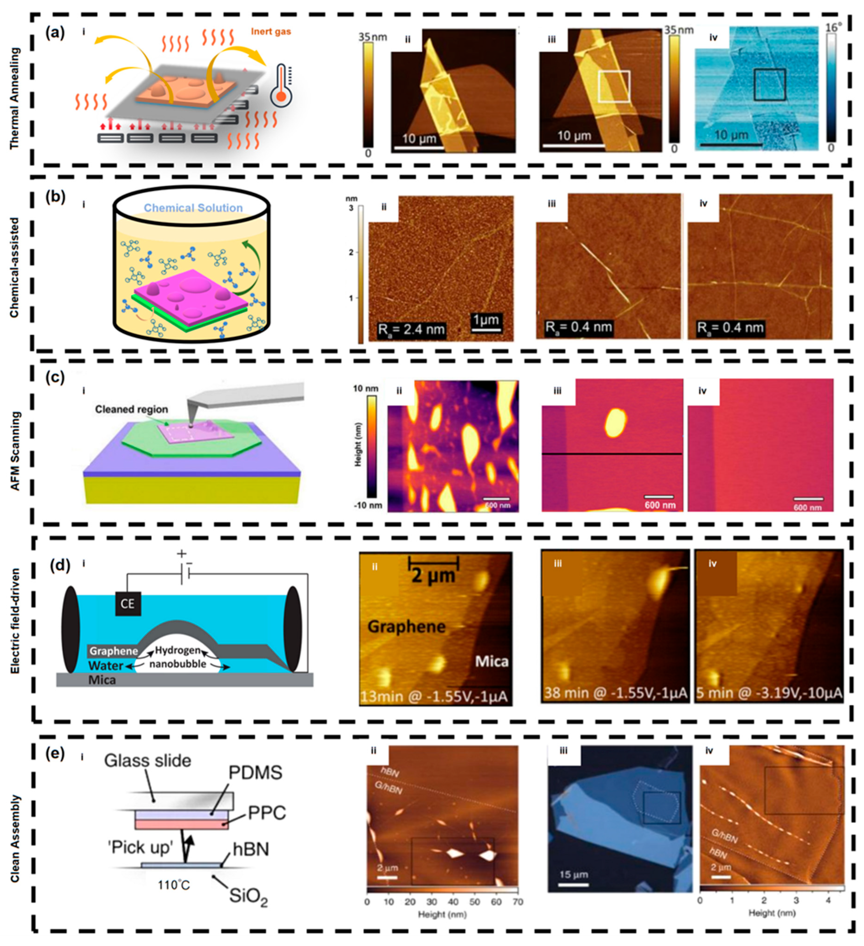 | AFM | AFM tip applies localized force to move and remove bubbles | High spatial precision; suitable for device-level post-processing; allows selective bubble removal in designated areas | Low efficiency; may introduce strain or mechanical damage | [22,103,112,113] |