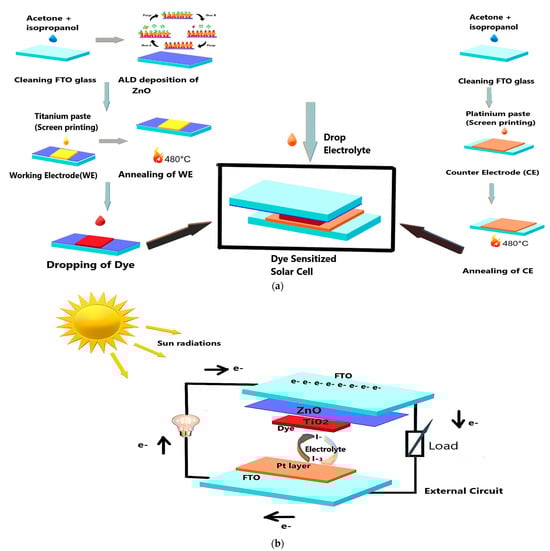 (a) Step-by-step fabrication of FTO-ZnO 500 dye-sensitized solar cells. (b) Components of FTO-ZnO dye-sensitized solar cells.