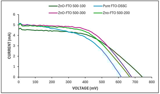 Figure 7 and Table 2 illustrate the clear positive influence of atomic layer deposition (ALD) temperature on the photovoltaic performance of dye-sensitized solar cells (DSSCs). The reference device, consisting of a bare fluorine-doped tin oxide (FTO) substrate without any additional metal oxide layer, exhibited a power conversion efficiency (PCE) of 3.76%, which is consistent with the typical efficiency range reported for FTO-based DSSCs [8]. Upon the introduction of ALD-deposited ZnO nanolayers onto the FTO substrate, a notable enhancement in device performance was observed. Specifically, the DSSC fabricated with ZnO deposited at 100 °C showed a 0.45% absolute increase in efficiency compared to the pristine FTO cell. This improvement demonstrated a distinct trend: as the ALD temperature increased, the device efficiency correspondingly improved. The sample fabricated with 500 ALD cycles of ZnO at 300 °C achieved the highest PCE of 4.63%. This indicates that, even under identical deposition cycles, the deposition temperature exerts a significant effect on the structural and functional quality of the ZnO films, thereby influencing the overall photovoltaic response of the DSSC [42].