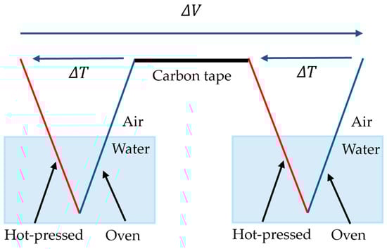To evaluate the influence of different drying methods on transpiration-type thermoelectric power generation, we prepare three types of CNTCPs: a hot-press-dried CNTCP (HPD-CNTCP), an oven-dried CNTCP (OD-CNTCP), and a halved CNTCP consisting of half hot-press-dried and half oven-dried areas on a single CNTCP (HPDOD-CNTCP) (Table 1). Then, we prepare 6.0 cm × 3.0 cm samples in the above-mentioned fabrication method. HPD-CNTCP is a sample where the whole sample is dried by HPD, and OD-CNTCP is a sample where the whole sample is dried by OD-CNTCP. HPDOD-CNTCP is a sample where half of the sample (3.0 cm × 3.0 cm) is subjected to HPD, while the other half is OD. As a comparative experiment, the central part of each of the three types of CNTCPs described above is folded and immersed in pure water, while both ends are fixed in air, as shown in Figure 2. In the case of HPOD-CNTCP, the central part serves as the boundary between the two drying methods. We measure the temperature at the left and right ends of the CNTCP and the overall generated t-E.M.F. The temperature at the left end of the sample is defined as Tl [°C] and that at the right end as Tr [°C]. The temperature difference between the left and right ends of the sample is calculated as ΔT, and t-E.M.F. across the sample is denoted as ΔV, as defined in Figure 2.