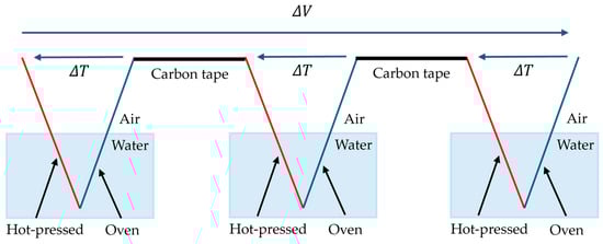 Generally, it is known that in thermoelectric power-generating materials, connecting multiple elements electrically in series and thermally in parallel allows greater output to be obtained from one heat source. In this study, to achieve higher output, multiple HPDOD-CNTCP samples are prepared and connected. Figure 3 shows a schematic of two-sheet structures, and Figure 4 shows a schematic of three-sheet structures. In HPDOD-CNTCP, here, the end of the HPD part of one sample is connected to the end of the OD part of another sample using carbon tape for simplicity. By connecting multiple samples in series in this way, the generation of a larger t-E.M.F. is expected.