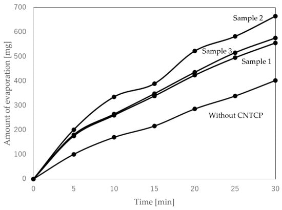 As described in the previous section, since the proposed HPDOD-CNTCP was found to be highly suitable for transpiration-type thermoelectric power generation, the next step was to investigate enhancing output by connecting these thermoelectric elements. To this end, three HPDOD-CNTCP samples were prepared, and their response was tested using the method described in Section 2.3. Table 4 shows the results of the temperature difference generated from each sample. The room temperature and water temperature at the start of this experiment were 23.9 °C and 23.2 °C for one and two sheets, and 25.8 °C and 24.8 °C for three sheets.
