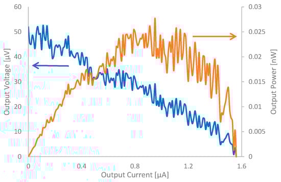 Table 3 shows the t-E.M.F., calculated Seebeck coefficient, and power output results obtained from the samples. Figure 9 shows the load curve of the sample measured using a semiconducting parameter analyzer (Semiconductor Characterization System, KEITHLEY, 4200A-SCS, Solon, OH, USA). In these experiments, the internal resistance before power generation was 17.3 W in the dry condition and 18.3 W in the wet condition for No. 1, 13.4 W (dry) and 28.0 W (wet) for No. 2, and 19.5 W (dry) and 24.2 W (wet) for No. 3, respectively. Differences in resistance exist depending on the drying method used for the samples. Since this study involves manual fabrication, there is some variation. However, the thickness of the samples differs significantly depending on whether a press is used. Consequently, even if the amount of CNTs used is the same, differences in density arise, leading to differences in conductivity. The results indicate that while t-E.M.F. was almost undetectable for No. 1 and No. 2, the t-E.M.F. of 47 μV was observed in No. 3, yielding a calculated Seebeck coefficient of 78.3 μV/K. Although there may be discussions about expressing this value as the Seebeck coefficient since it combines two areas separated by a fold, this paper assumes it is the Seebeck coefficient because the material responsible for the thermoelectric performance is only one type of CNT contained in CNTCP. In our previous study [26], the Seebeck coefficient of a single CNTCP sheet prepared using SG101-CNT was approximately 40 μV/K. As described above, the Seebeck coefficient of HPDOD-CNTCP was 78.3 μV/K, approximately twice the value obtained in the previous study. This is because, even using a single type of CNT, the composite paper form and the application of HPD and OD treatments enabled effective utilization of the thermal gradient. Here, since the measurement was performed with water contained within the samples, all data should be considered as device-effective values. We also found the values to be 36.6 µV/K for HPD and 42.5 µV/K for OD when no water was used, and a temperature difference was induced by applying a heat source to one side of the samples. Therefore, we believe heat transfer losses due to water have some degree of influence. Since the Seebeck coefficient of the samples has been estimated, the next point of interest is the values of the thermoelectric figure of merit ZT and conversion efficiency of the samples. To calculate conversion efficiency, it is necessary to determine ZT. Calculating ZT requires deriving the power factor (PF) of the sample and thermal conductivity. While PF was calculated as