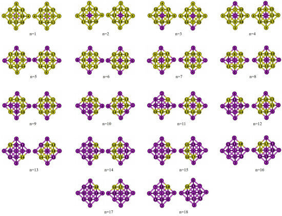 Different chemical ordering configurations were explored by progressively replacing Rh atoms in the core region with Ir atoms. For the binary end-members Pd60Rh19 and Pd60Ir19, a perfect core–shell segregation is observed, with the entire core region exclusively composed of Rh or Ir atoms, respectively (Figure 2). When a single Ir atom is introduced (n = 1), it preferentially occupies the central atom site. At n = 2, Ir atoms are located at opposite vertex positions within the core region. Increasing to n = 3, the third Ir atom fills a vertex adjacent to an already occupied vertex, resulting in three Ir atoms situated at vertex positions. For n = 4, however, the additional Ir atom returns to the central site instead of occupying a vertex. In the n = 5 configuration, vertex occupation resumes, and by n = 6, all six vertex sites are fully occupied by Ir atoms, representing the most symmetric distribution among all compositions (Figure 3). This configuration corresponds to the most favorable chemical ordering in the mixing-energy profile, as shown in Figure 4. After the six vertex sites are occupied at n = 6, the seventh Ir atom fills the central site (n = 7). From n = 8 onward, additional Ir atoms begin to occupy inner edge positions. With further addition of Ir atoms, the occupation of inner edge sites progresses systematically, first filling adjacent edges within the same facet and then extending to other facets. This progressive and site-selective filling pattern explains the oscillatory trend observed in the mixing energy curve (Figure 4), as Ir atoms alternate between energetically favorable and less favorable positions.